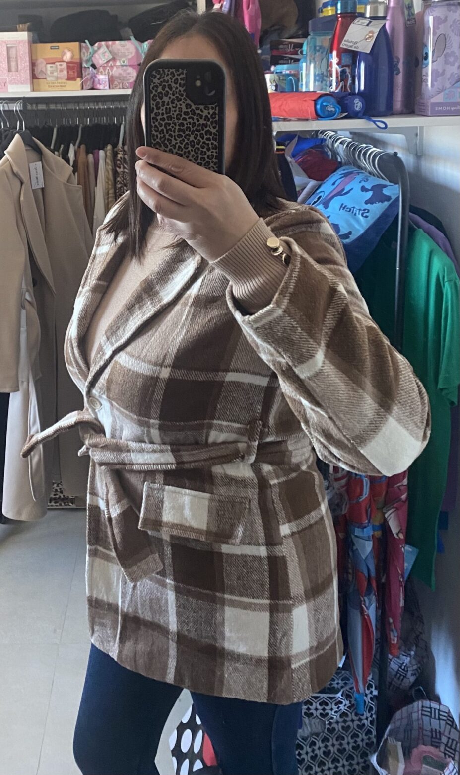 Abrigo de paño con estampado de cuadros, con botón y cinturón, talla única