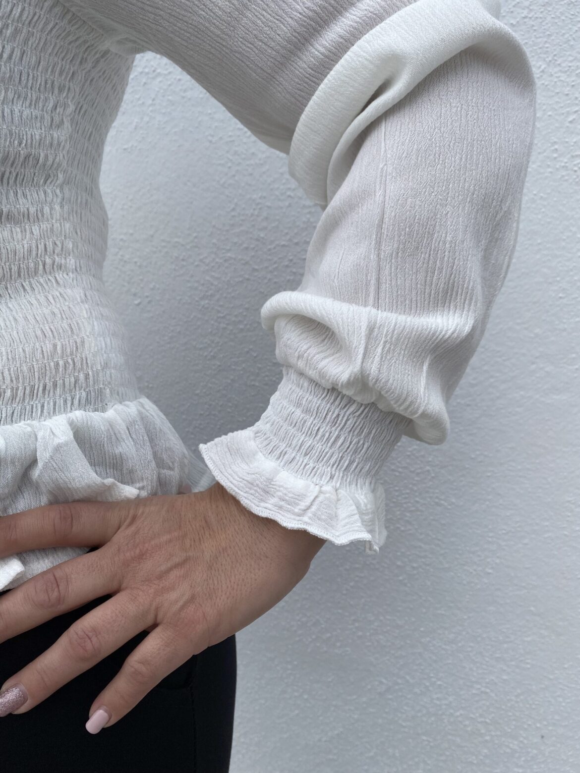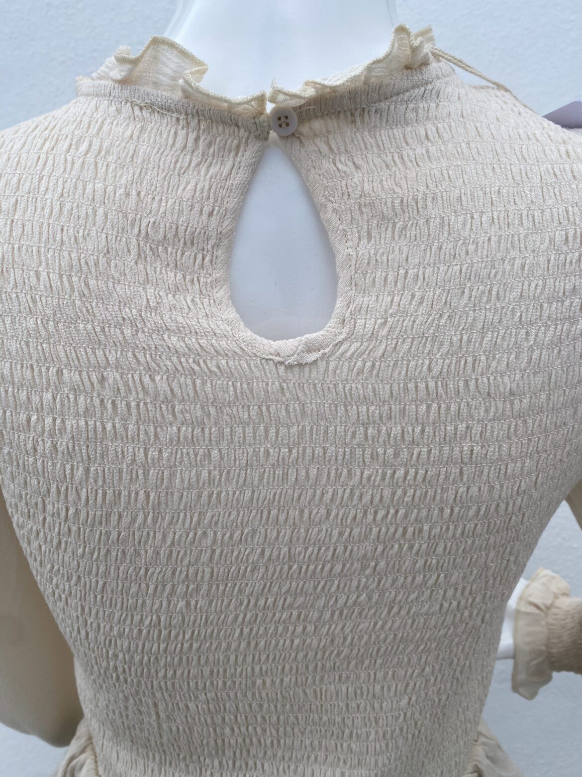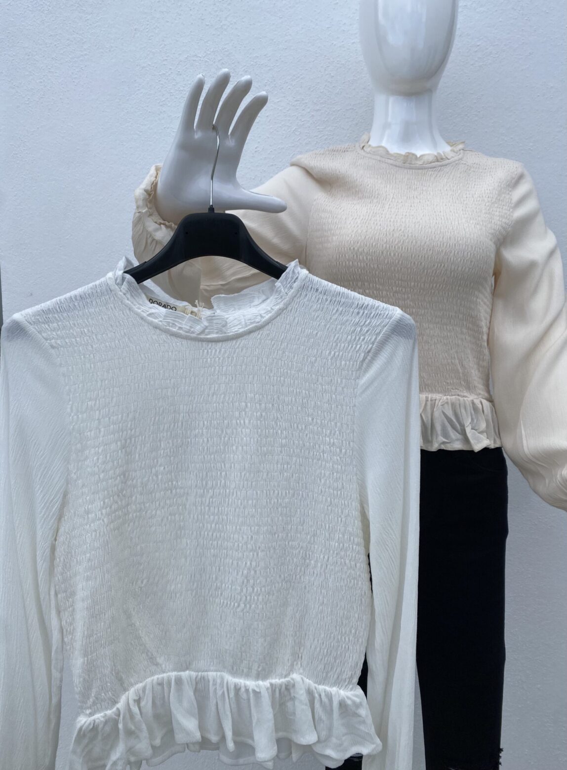 Blusa con volantes en cintura y puños en color blanca y beige, tallas M y L