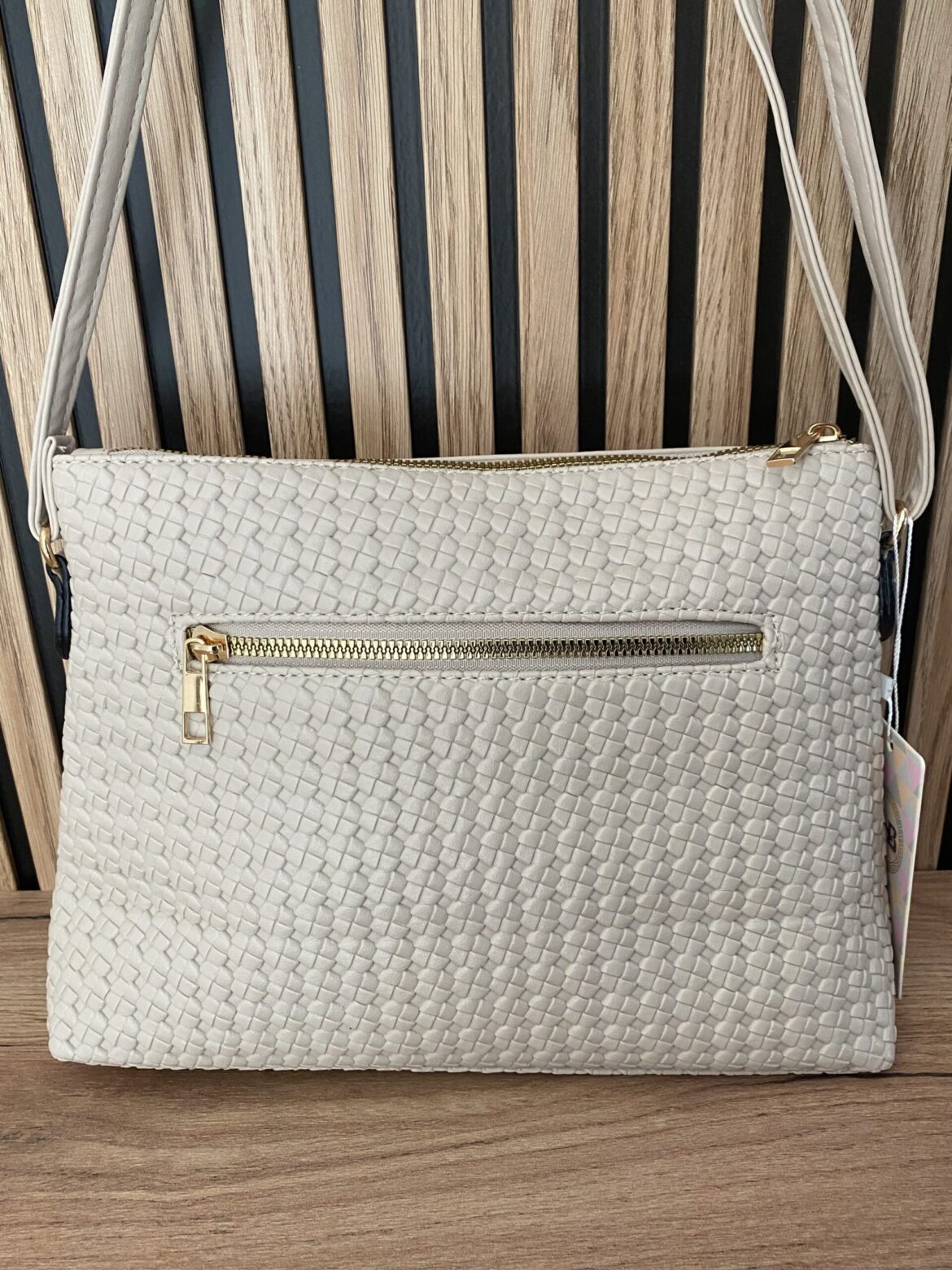 Cierre con cremallera, tiene un bolsillo exterior e interior