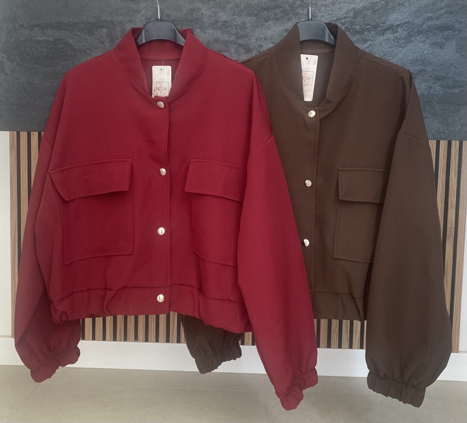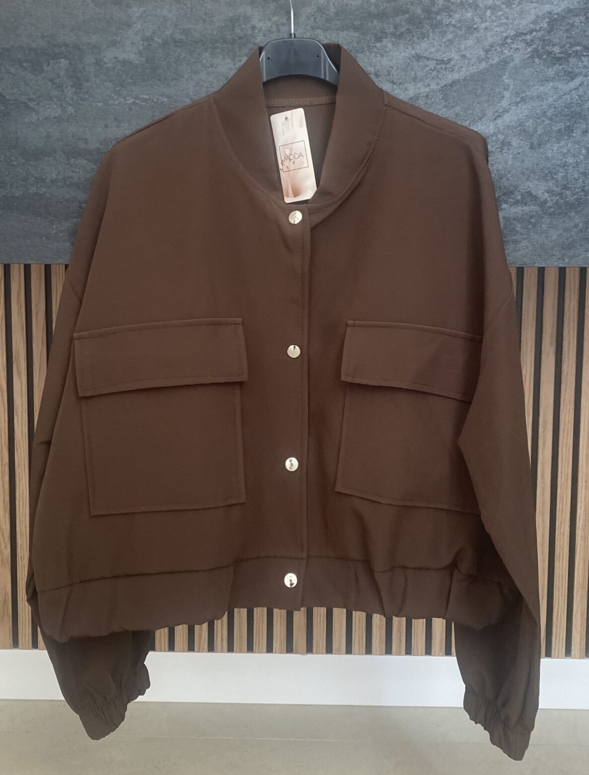 Bomber con bolsillos delanteros, puños y parte de abajo engomada, talla única, disponible en color burdeos y color marrón chocolate.