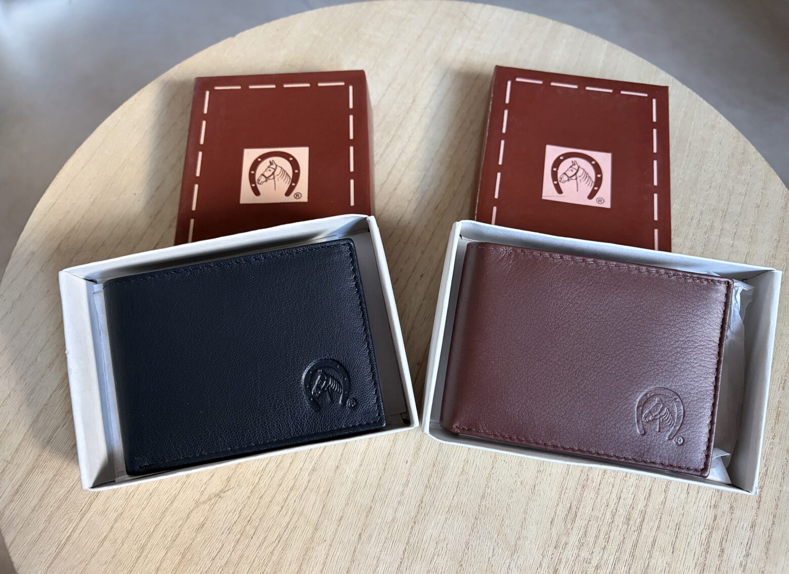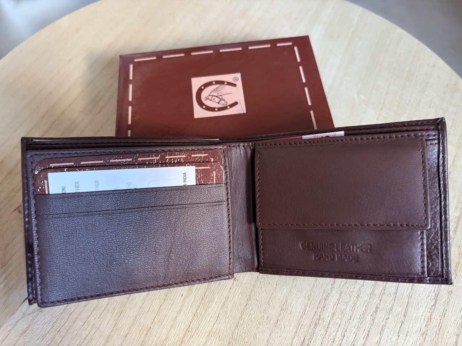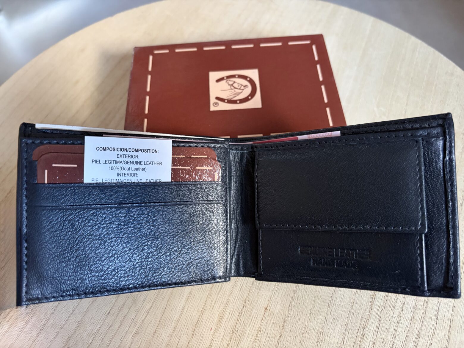 Cartera de caballero de piel, con portamonedas, disponible en color cuero y color azul marino.