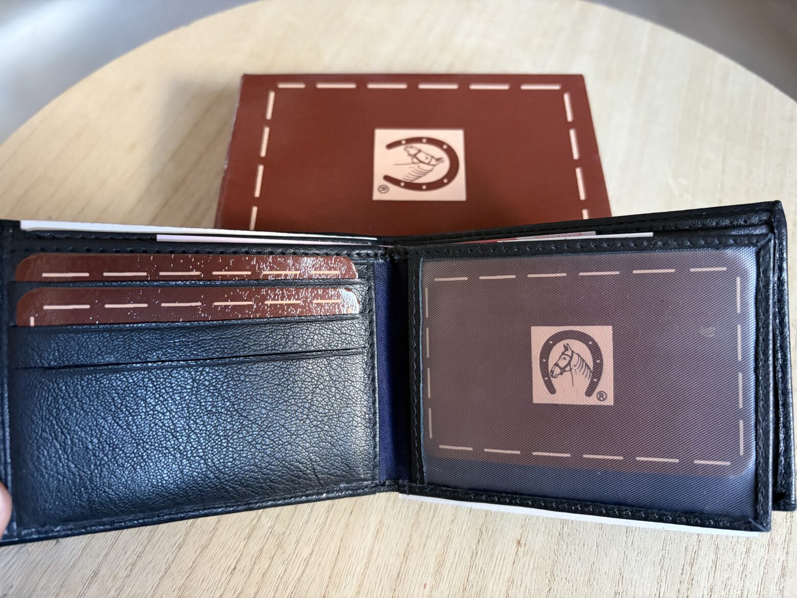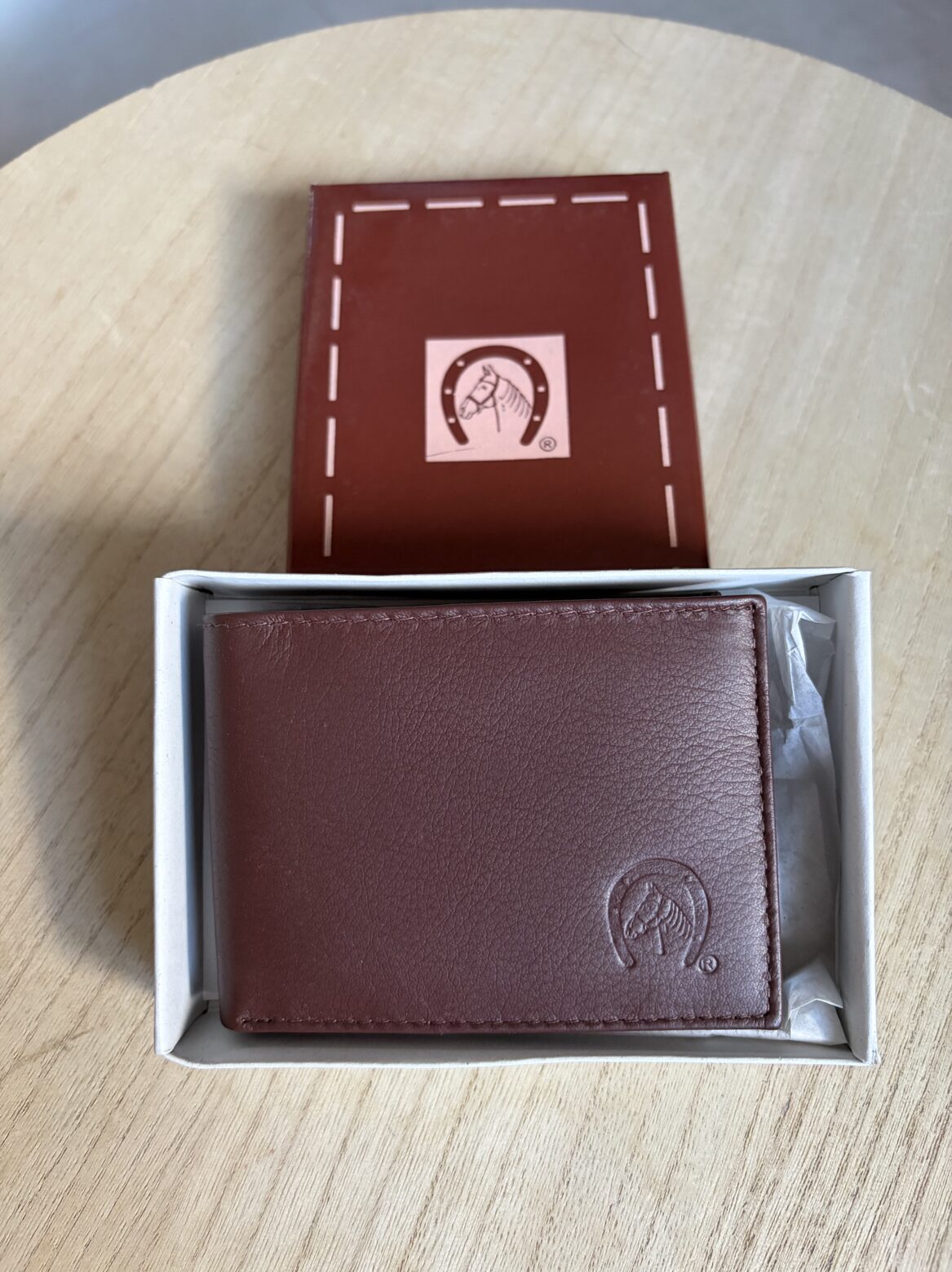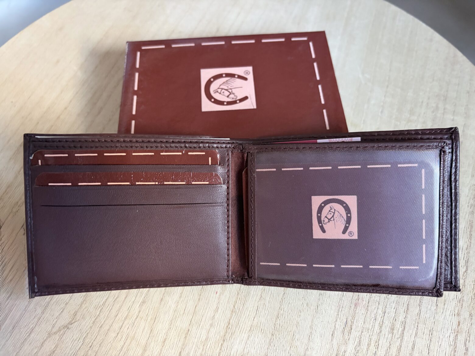 Cartera de caballero de piel, con portamonedas, disponible en color cuero y color azul marino.