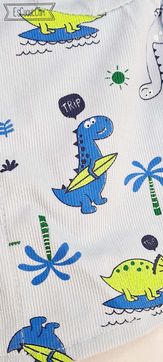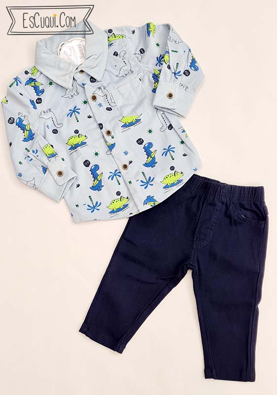 Conjunto de bebé compuesto de camisa de micropana en azul con estampado de dinosaurios y pantalón en color azul marino con la cintura toda de goma.