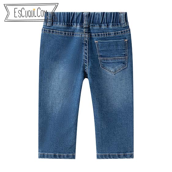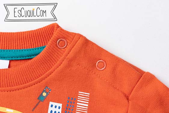 Conjunto de bebé compuesto de pantalón vaquero elástico con cintura de goma y sudadera en color naranja. Tiene detalles de cochecitos. Marca: Newness