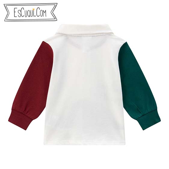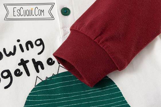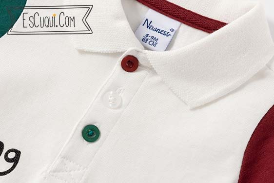 Conjunto de bebé compuesto de pantalón vaquero gris elástico con cintura de goma y polo blanco. Tiene detalles de dinosaurios.