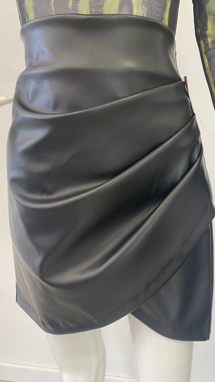 La falda de polipiel en color negro es la elección perfecta para quienes buscan añadir un toque de sofisticación a su armario. Con un diseño cruzado por delante que aporta un aire moderno y una cremallera discreta en la parte trasera, esta prenda es ideal para resaltar tu figura y ofrecer un ajuste cómodo.