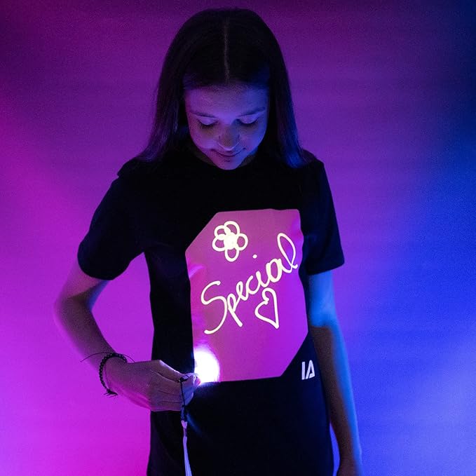 ¡Prepárate para iluminar la habitación con la camiseta más genial del mundo! La camiseta interactiva luminosa Illuminated Apparel es perfecta para los niños que aman divertirse y ser el centro de atención. Con su característica única de brillo interactivo, los niños pueden dibujar y esbozar con el bolígrafo luminoso especial incluido. Ya sea que estés tocando en una fiesta, actuando en el escenario o simplemente pasando el rato con amigos, esta camiseta te convertirá en la estrella del espectáculo. ¡Así que no tengas miedo de brillar como una estrella fugaz y consigue tu camiseta interactiva luminosa Illuminated Apparel hoy mismo!
