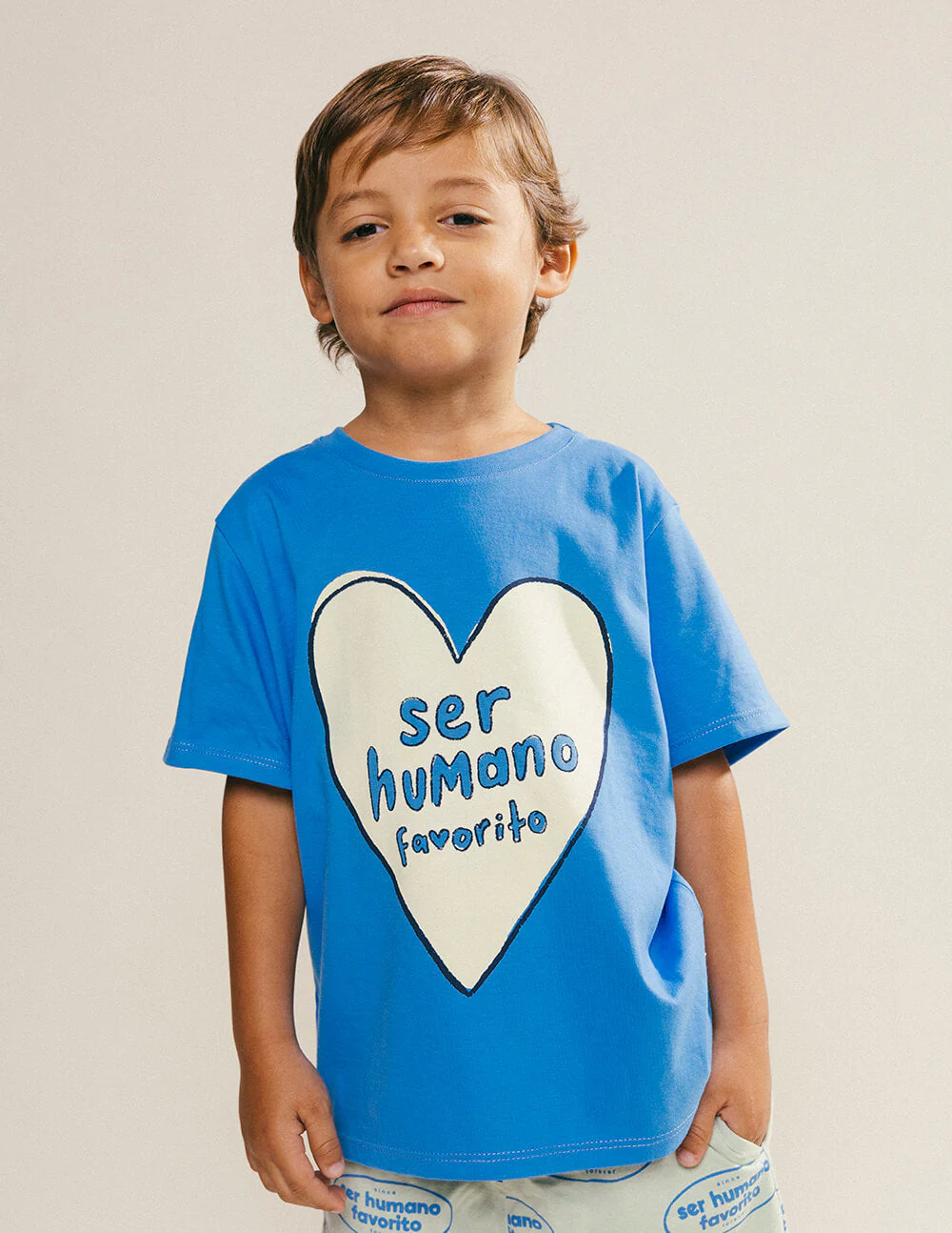 Camiseta infantil, para niñas y niños, con fit suelto, de manga corta, cuello redondo con rib. Un mensaje muy especial «Ser humano favorito» en color amarillo claro sobre tela en azul brillante. Un mundo mejor comienza en los corazones de nuestros niños, nuestros seres humanos favoritos. Vistamos su día a día con esperanza, para que con cada paso, siembren paz y cosechen un universo de amor. Por ser una prenda hecha en algodón pima peruano garantiza una frescura y calidad inigualable.
