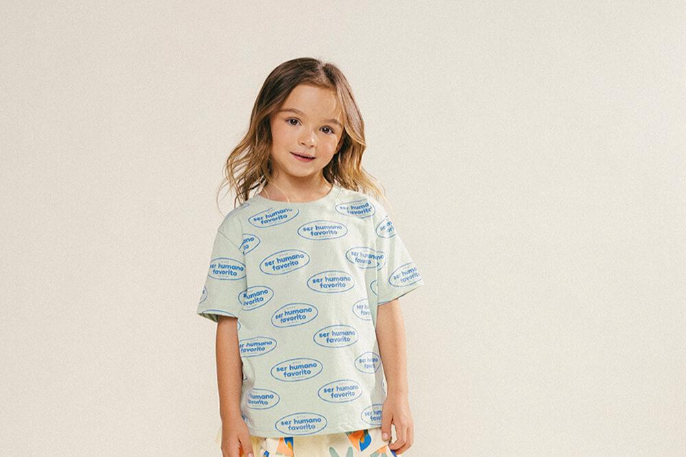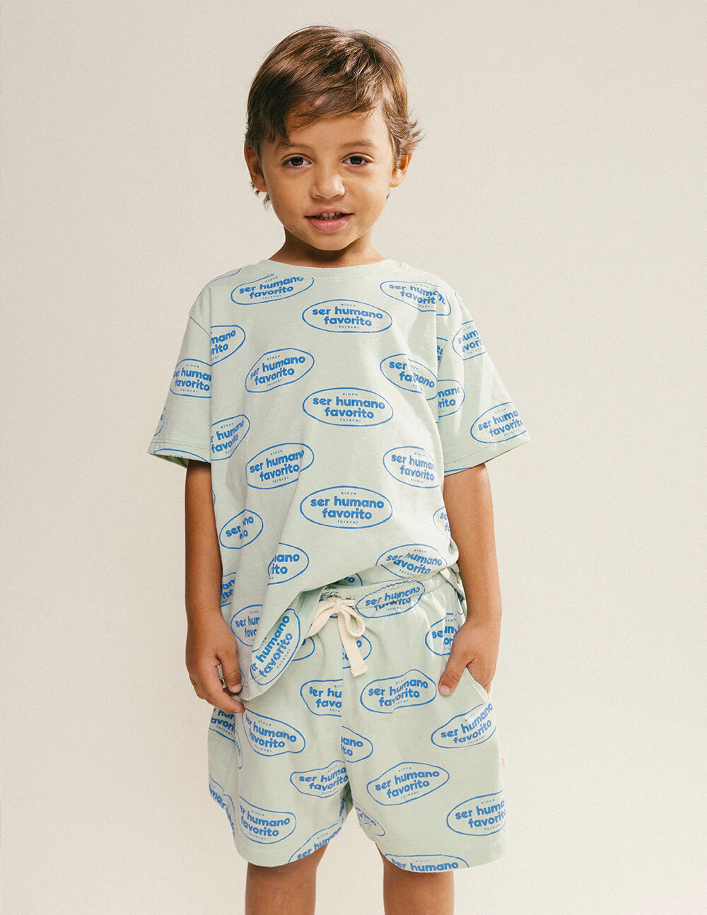 Camiseta infantil, para niñas y niños, con fit suelto, de manga corta, cuello redondo con rib. Estampado de sellos con textos que dicen «Ser humano favorito» en color azul sobre tela verde pastel. Un mundo mejor comienza en los corazones de nuestros niños, nuestros seres humanos favoritos. Vistamos su día a día con esperanza, para que con cada paso, siembren paz y cosechen un universo de amor. Por ser una prenda hecha en algodón pima peruano garantiza una frescura y calidad inigualable.