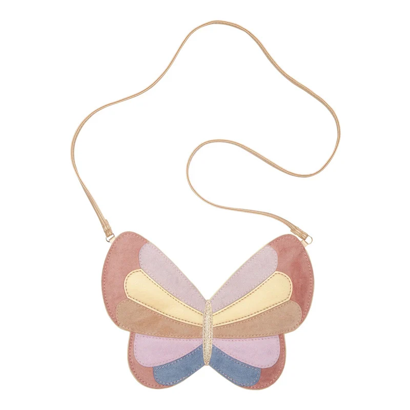 Vuela alto, mariposa. Este hermoso bolso con forma de mariposa está elaborado con las telas de gamuza más suaves y tiene detalles en dorado metálico. ¡Es un regalo perfecto para cualquier pequeña fanática de Flutterby!