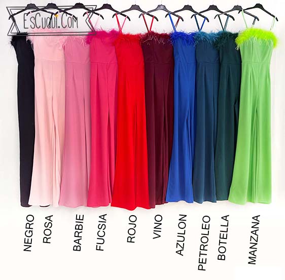 Mono de fiesta con escote decorado con plumitas muy suaves.