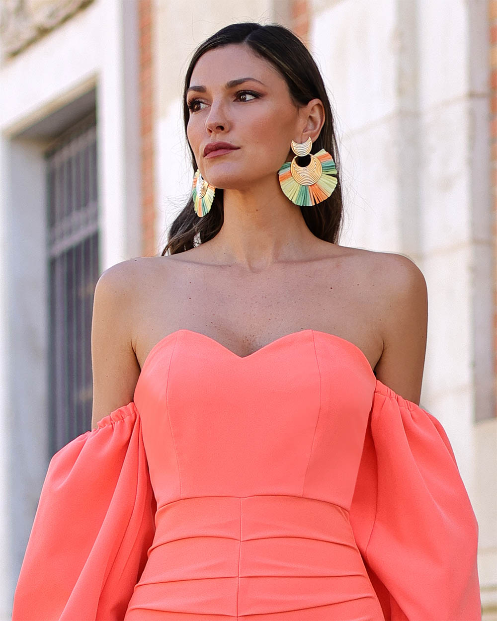 El vestido Abril mandarina es uno de los vestidos para invitadas de boda más refinados . Con escote en forma de corazón, manga globo y abertura delantera en su falda, es ideal para deslumbrar en tu próximo evento.