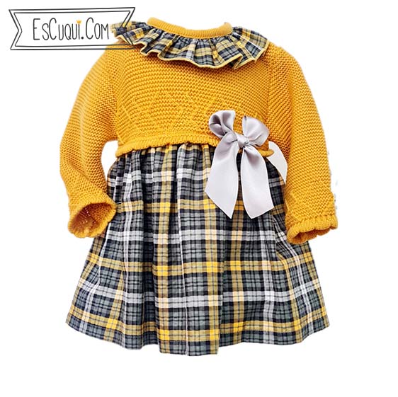 Vestido de niña de cuadritos con la parte de arriba de punto en color mostaza. Es de manga larga y tiene un precioso lazo en la cintura.