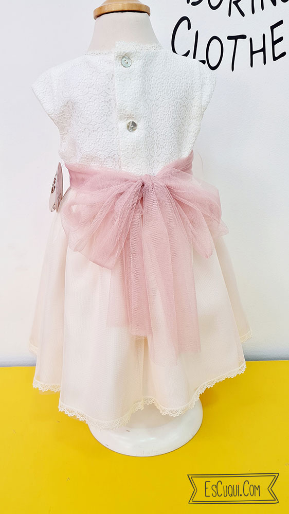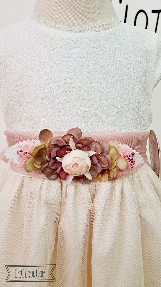 Vestido de arras y ceremonia en color blanco y rosa asalmonado con falda y lazo de tul con detalle de flores en el cinturón: