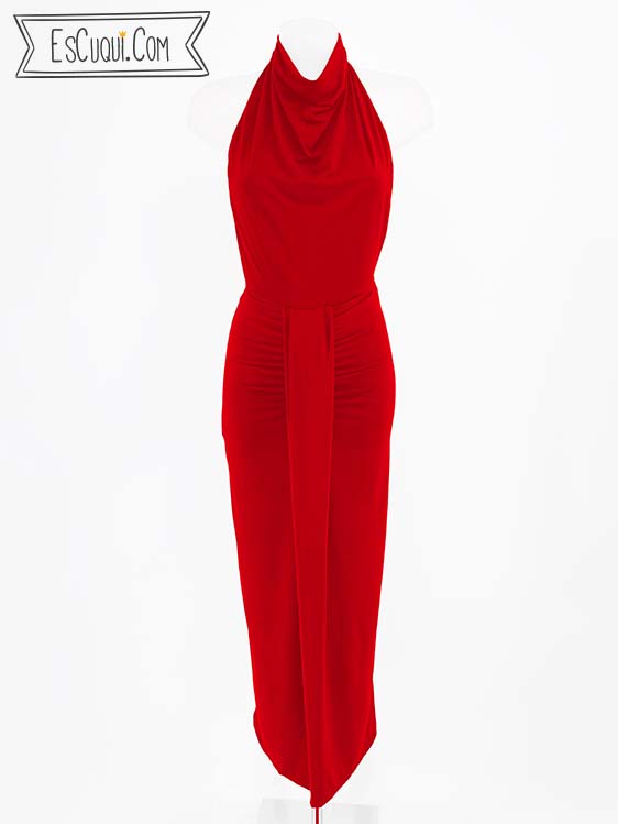 Vestido largo para eventos, ceremonias, graduaciones y bodas. Tiene un favorecedor cuello halter con la espalda abierta que estiliza mucho la figura. Su drapeado hace que sea un diseño cómodo de llevar.