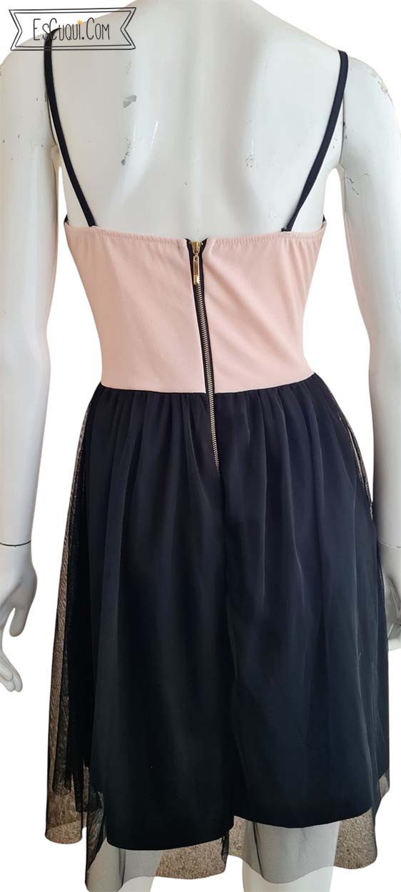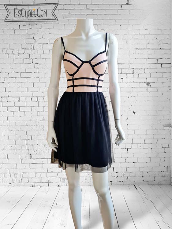 Vestido corto de tirantes con la parte de arriba tipo corsé con tirantes finos y la parte de abajo en tul negro.