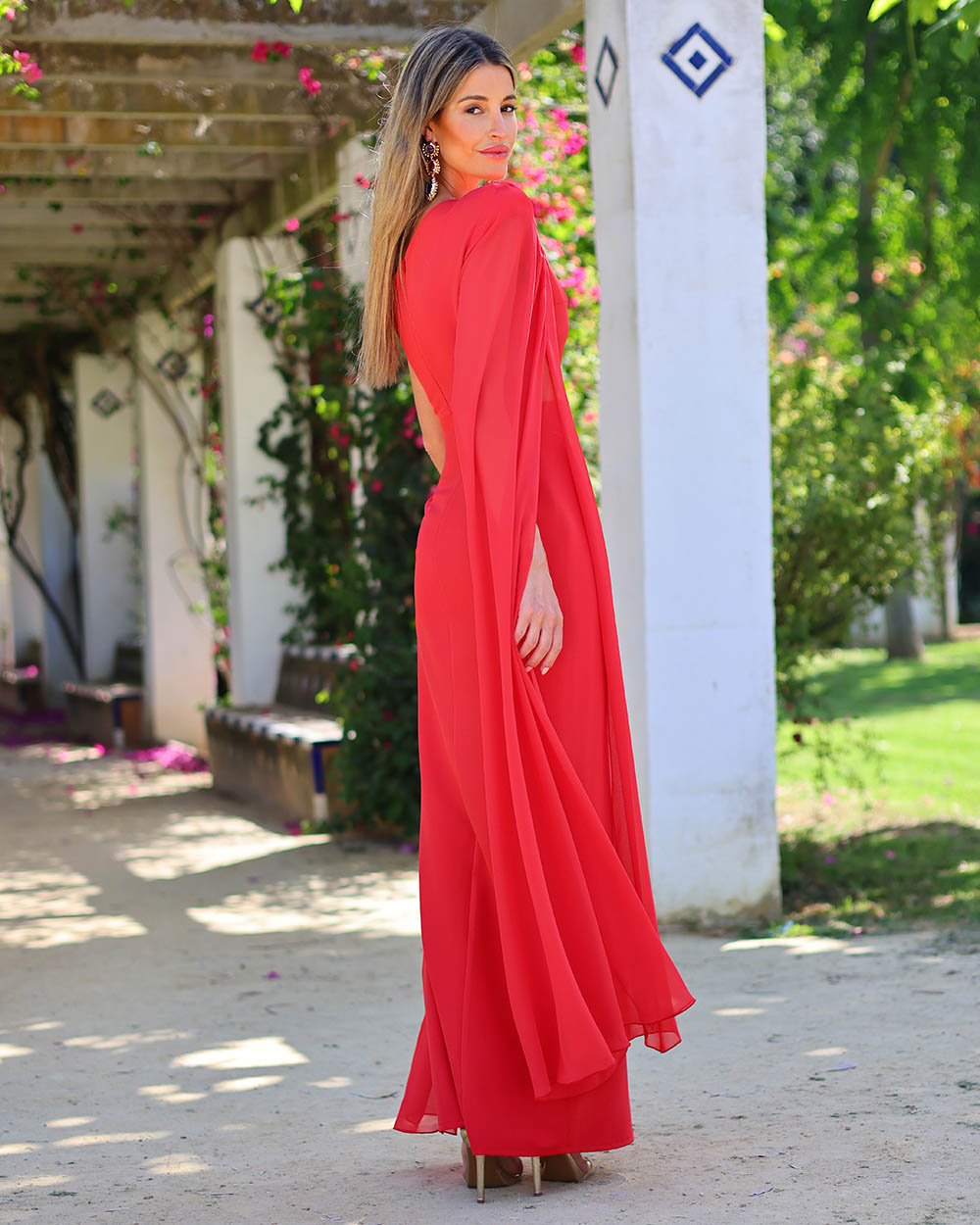 Vestido asimétrico con manga capa de gasa y capa en la cintura. Tiene abertura en la pierna izquierda.