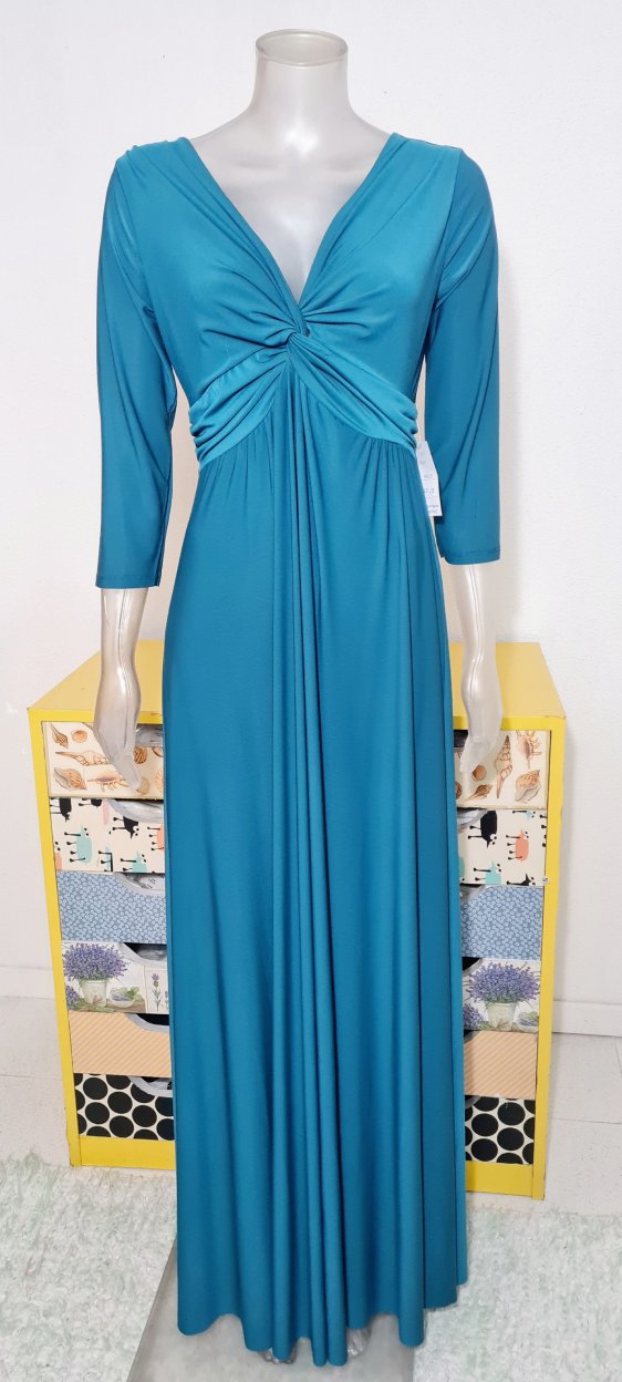 Vestido largo de fiesta con corte al pecho que favorece mucho y disimula la zona de la barriga. Tiene manga tres cuartos y el tejido tiene muchísima caída.