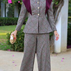 Vestido con mangas de gasa y puños abotonado con dos botones dorados. El pecho está cruzado por una gasa. Tiene hombreras